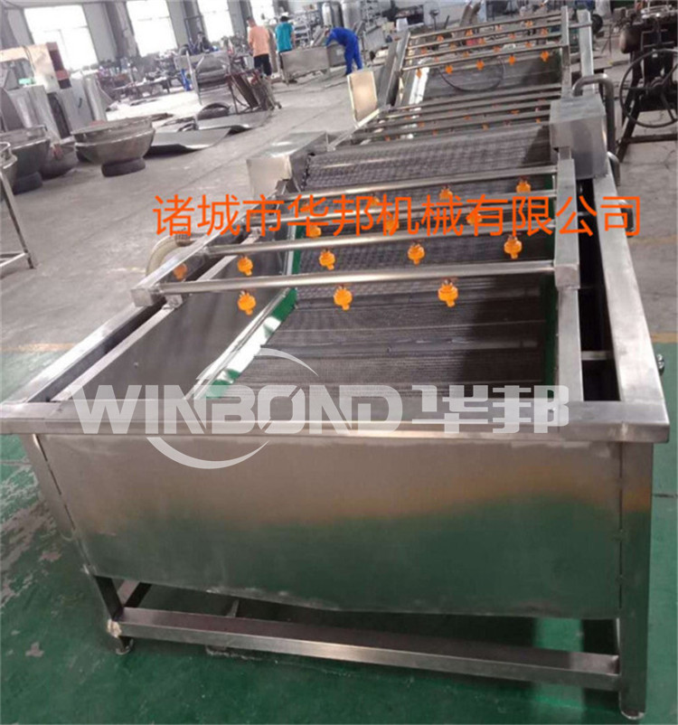 該設(shè)備配有鼓泡、沖浪、噴淋等裝置,可適用于蔬菜水果水產(chǎn)品等顆粒狀、葉類、根莖類產(chǎn)品的清洗。本機除電機、風(fēng)機、循環(huán)泵以外,其他均采用SUS304不銹鋼材料,符合 食品行業(yè)使用標準。本機采用鼓泡、沖浪、提升處凈水噴淋。一側(cè)有去雜循環(huán)水箱,所有雜物經(jīng)此水箱過濾去雜,其中網(wǎng)帶提升處為凈水噴淋。