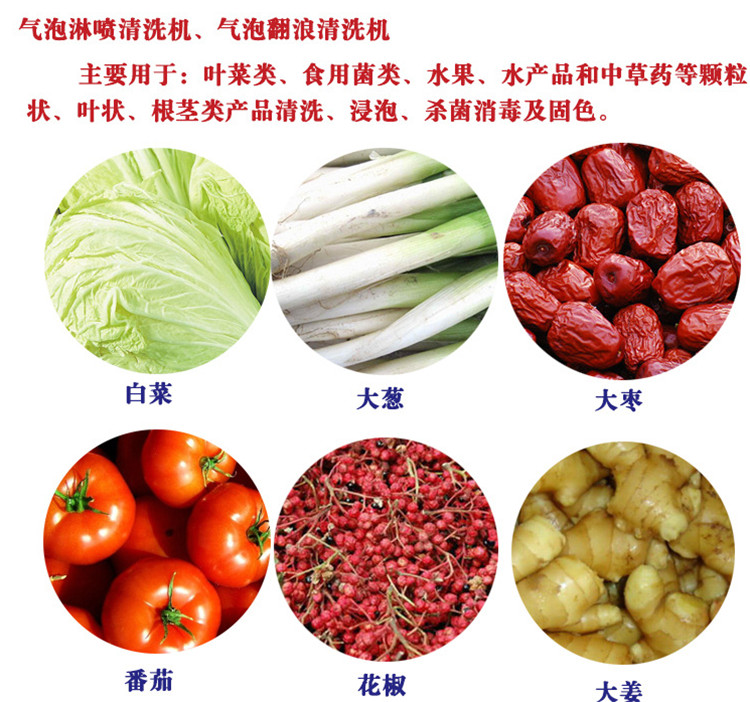 蔬菜,水果、水產(chǎn)品等顆粒狀、葉狀、根莖類產(chǎn)品清洗、浸泡、和對腌漬品脫鹽等。辣椒、小白菜、蘑菇、菠菜、青菜、包菜、生菜、韭菜、蒜苗、芹菜、龍須菜、苘蒿、山蟄菜、空心菜、木耳、銀耳、地耳、石耳、平菇、草菇、金針菇、茶樹菇、裙帶菜等