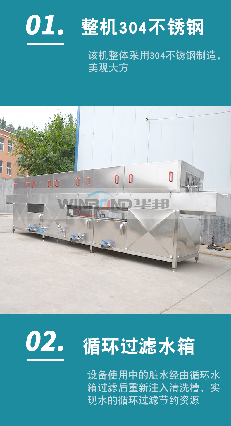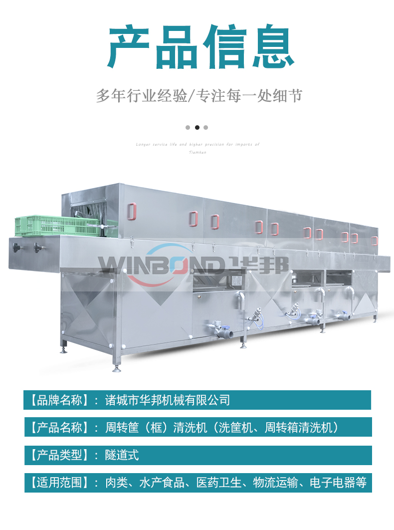 帶自動控水裝置,以防水泵因缺水導致?lián)p毀。整機為不銹鋼SUS304不銹鋼材質。因各廠家所用周轉筐規(guī)格及樣子不同,具體設備相關參數(shù)可根據(jù)實際周轉筐外型尺寸專門設計定制 。
